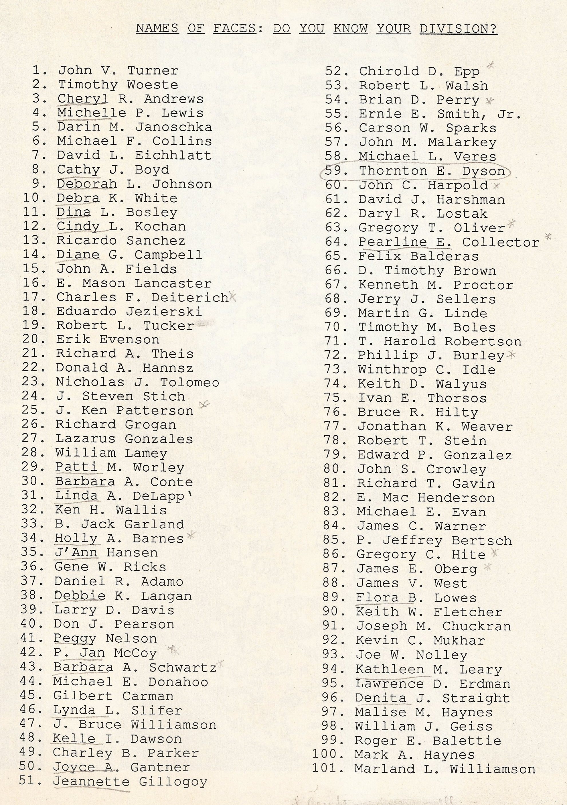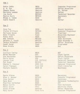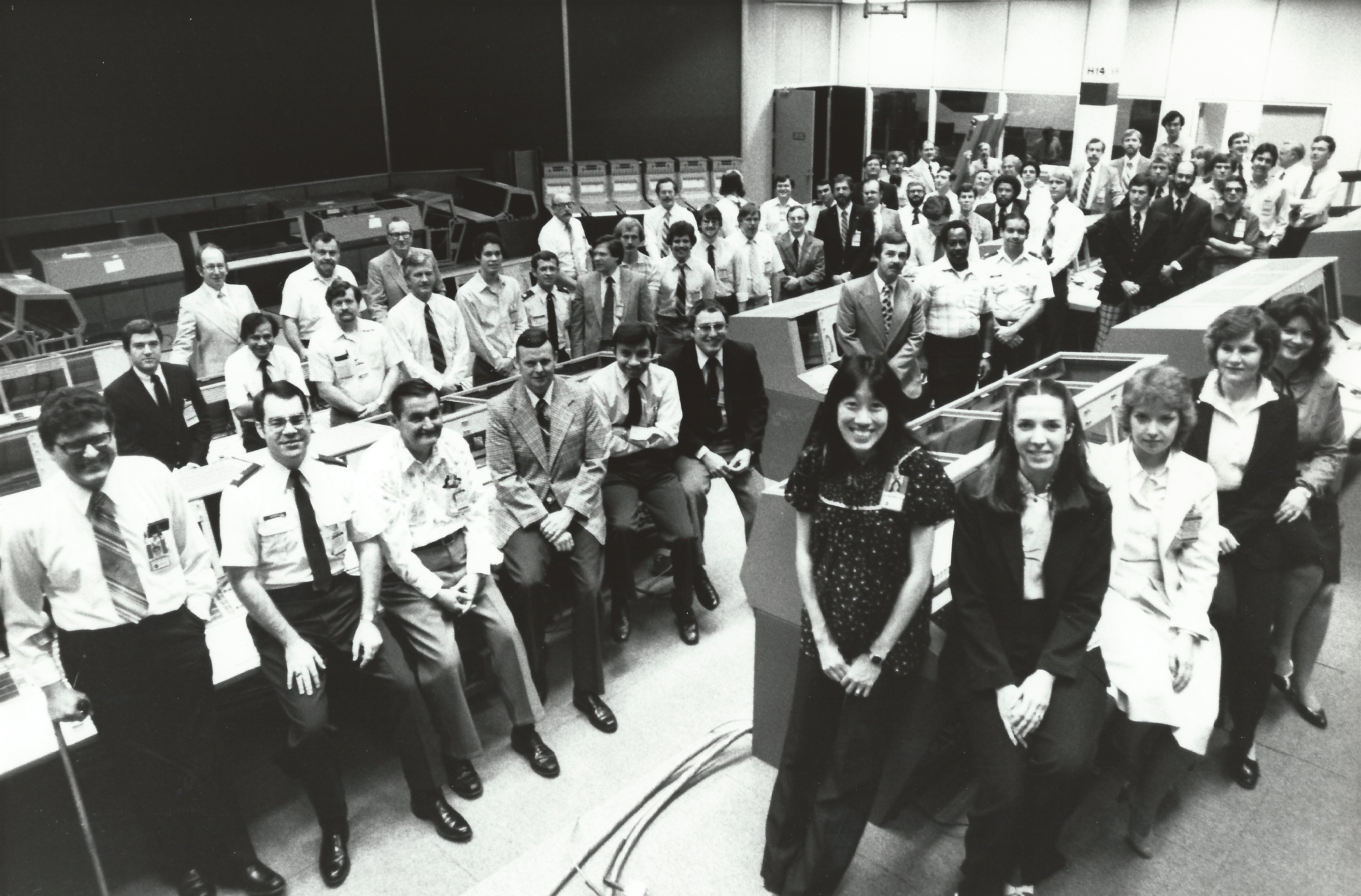 1981 Mission Operations Women L to R, Row 1: Robin Cobbs, E.M. Eav, Rowena Burns, Maridene Lemmon, Iva Doyle, Monica Davis, Mindy J. Cohen, Cadie Howard; Row 2: Anne Fox, Elaine Hilliard, Marianne Dyson, Anne Flippin, Panna Amin, Ann Johnson, Delores A. Couch, Teresa McDonald, Sandi Kovar, Anne Accola; Row 3: Carolynn Conley, Helen Meester, Eva Hernandez, Maria Garza, Carmen Cruz, Pat Engel, Sharon C. Conover, Karen Flanagan, Georgie Huepers; Row 4: Marie Gibson, Nina J. Weaver, Irma Cortez, Sara Beck, Pearline Collector, Nancy Harris, Patsy Smith, Susan Wilson, Mary Barth; Row 5: M. Edson, M.E. Mabry, Ruth Ann Brinkworth, Barbara Hopkins, Dianne Murphy, H.A. Barnes, Terry Stanford, Kathie Abotteen, Michele Brekke, Alice Van Gilder, Ceevon (Mi-Mi) Lau, Dianna Watson, Cynthia Nagy.