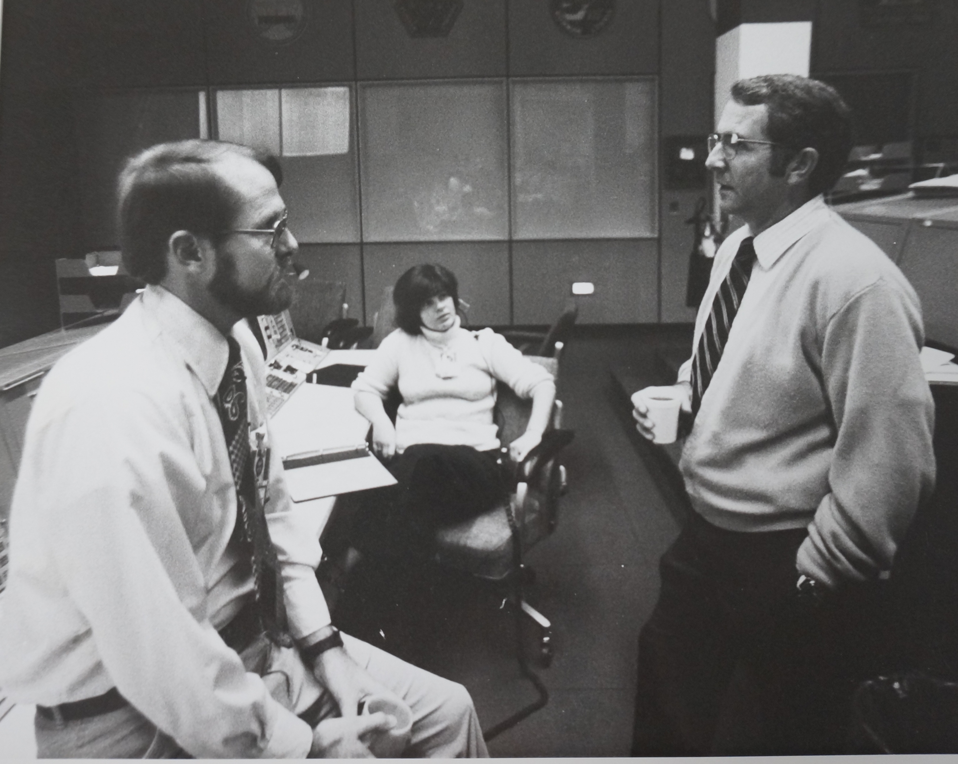 Liz Cheshire was Computer Command for STS-1. DPS Randy Stone and Astronaut Dick Truly in foreground. (NASA photo)